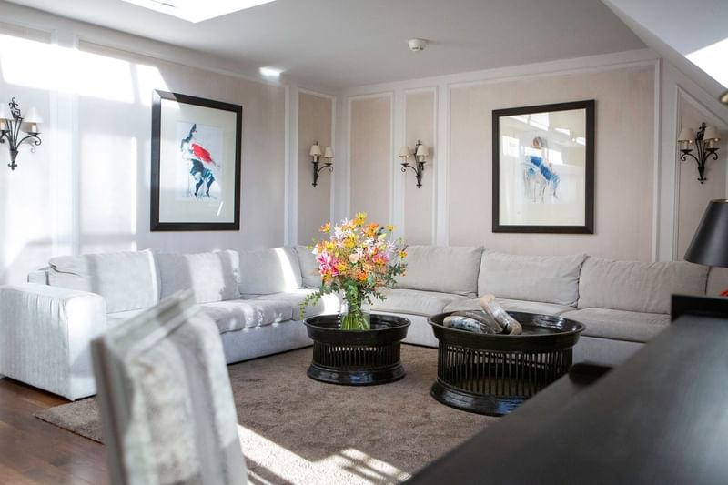 Our luxurious Presidential Suite, spanning 140 sq.m., is spread over two floors and offers you an elegant seating area with an open fireplace on the gallery. The floor-to-ceiling glass fronts provide plenty of daylight and offer direct access to your own balcony. The unique suite is considered our ‘music room’: thanks to a Steinway Grand Piano in the living room, it is particularly popular with our guests from the classical music scene.